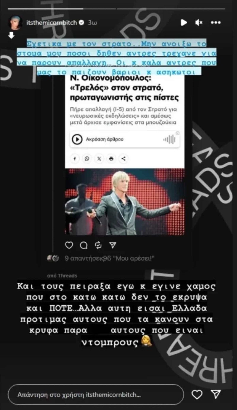 «Σχετικά με τον στρατό… Μην ανοίξω το στόμα μου πόσοι δήθεν άντρες τρέχανε για να πάρουν απαλλαγή… Οι και καλά άντρες που μας το παίζουν βαριοί και ασήκωτοι. Και του πείραξα εγώ και έγινε χαμός που στο κάτω κάτω δεν το έκρυψα ΠΟΤΈ… Αλλά αυτή είναι Ελλάδα προτιμάς αυτούς που τα κάνουν στα κρυφά παρά αυτούς που είναι ντόμπρους», έγραψε χαρακτηριστικά.