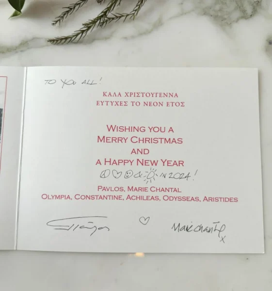 Όσο για την ευχή, αυτή αναφέρει: “Καλά Χριστούγεννα και ευτυχές το νέο έτος εύχεται η οικογένεια του Παύλου και της Μαρί Σαντάλ τόσο στα Ελληνικά όσο και στα αγγλικά”.