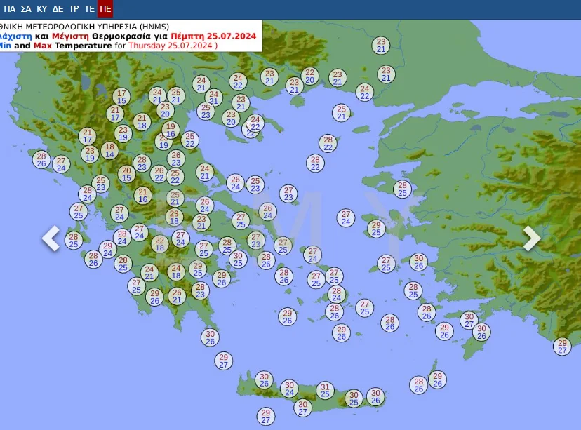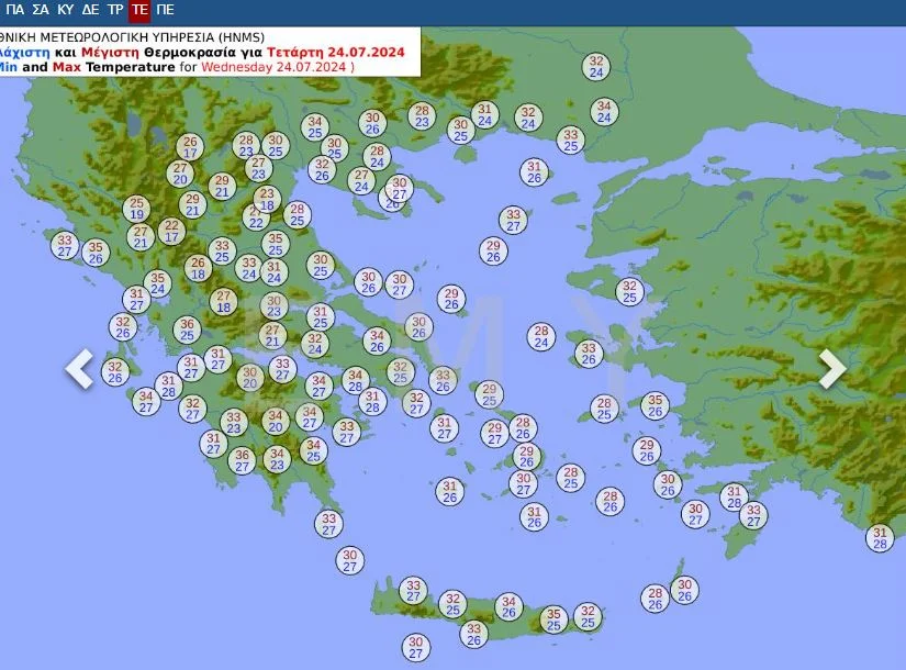 - Στην υπόλοιπη νησιωτική χώρα: 34 με 36 βαθμούς Κελσίου.