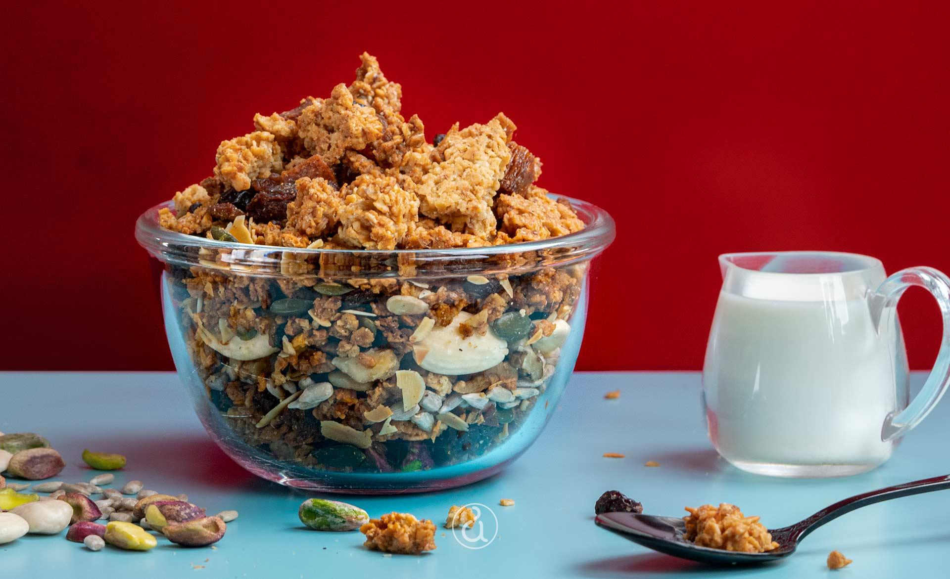 Ψύξη και Αποθήκευση: Τέλος αφήνουμε τη γκρανόλα να κρυώσει πλήρως πριν την αποθήκευση σε γυαλινό σκεύος που κλείνει αεροστεγώς. Διατηρείται σε θερμοκρασία δωματίου για εβδομάδες.