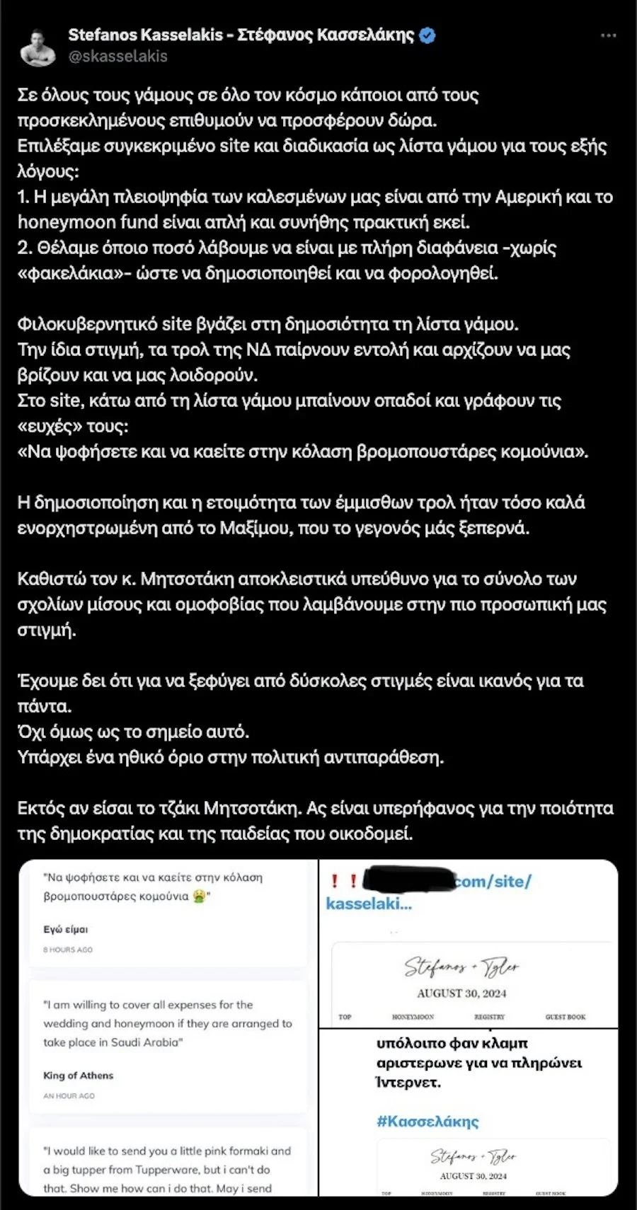 Ο Στέφανος Κασσελάκης, σε ανάρτησή του στις 17 Αυγούστου, σχολίασε την απόφασή του και του συντρόφου του να δημιουργήσουν λίστα γάμου σε αμερικανική ιστοσελίδα. Όπως ανέφερε, σε όλους τους γάμους παγκοσμίως, κάποιοι καλεσμένοι θέλουν να προσφέρουν δώρα. Και το ζευγάρι επέλεξε αυτή τη διαδικασία για δύο λόγους: πρώτον, η πλειονότητα των καλεσμένων τους είναι από την Αμερική. Και δεύτερον, ήθελαν να υπάρχει πλήρης διαφάνεια και να μπορούν να δημοσιοποιηθούν. Επίσης και να φορολογηθούν τα ποσά που θα λάβουν, χωρίς την ύπαρξη «φακέλων».