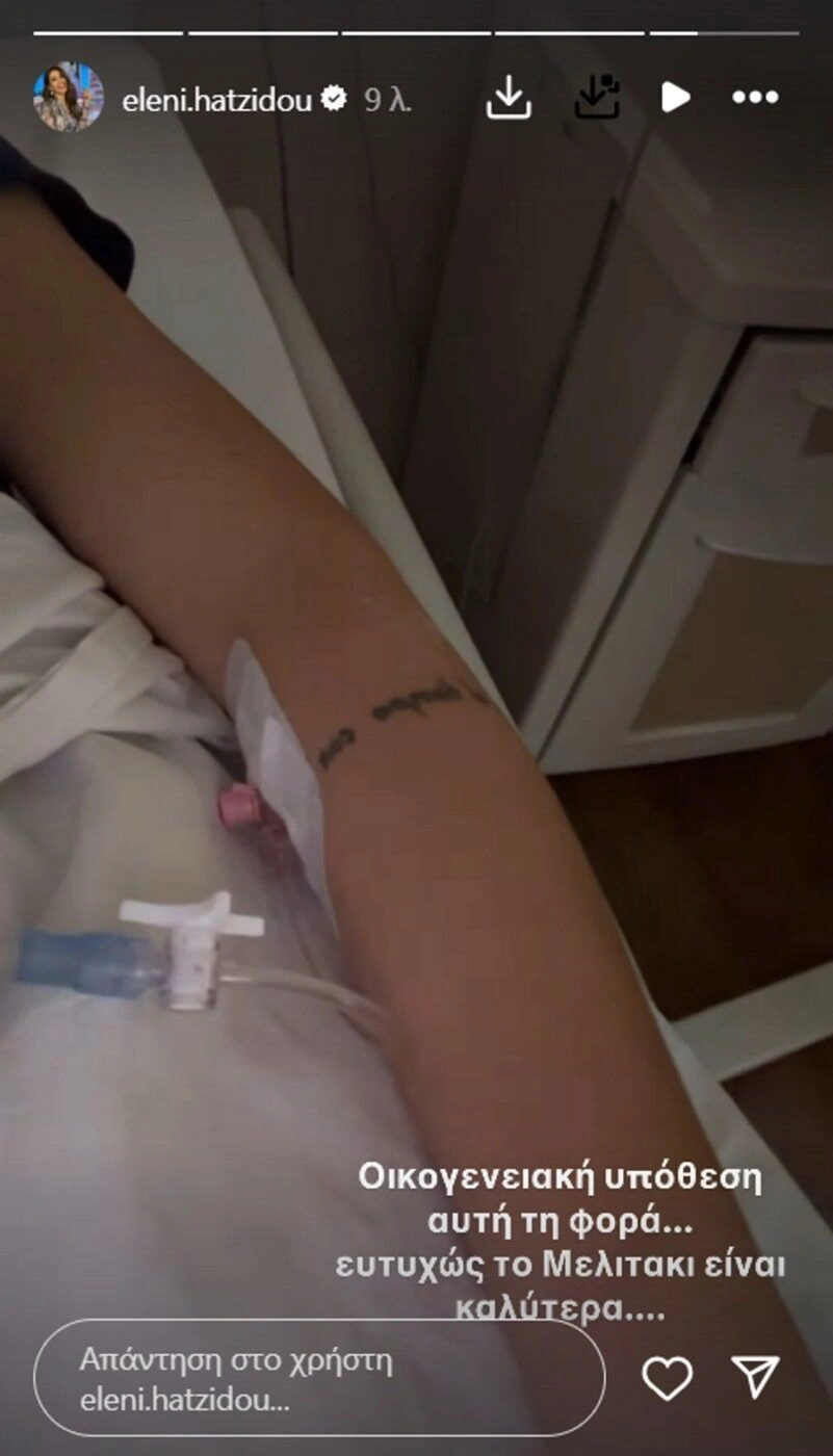 Η κόρη της γνωστής τραγουδίστριας και παρουσιάστριας χρειάστηκε να εισαχθεί στο νοσοκομείο. Σήμερα το πρωί της Κυριακής, η ίδια η Ελένη Χατζίδου ενημέρωσε τους followers της στα social media ότι νοσηλεύεται και εκείνη. Δημοσιεύοντας μια φωτογραφία όπου φαίνεται ξαπλωμένη στο κρεβάτι με ορό.