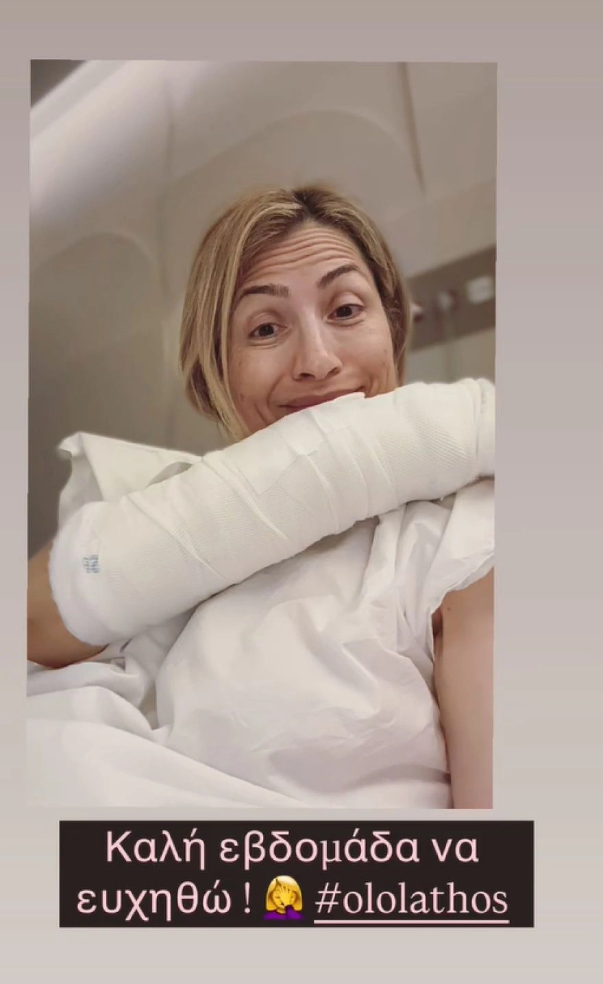 Συγκεκριμένα, η γνωστή παρουσιάστρια κοινοποίησε μια εικόνα όπου φαίνεται το χέρι της να είναι δεμένο. Στη λεζάντα της φωτογραφίας που ανέβασε από το νοσοκομείο όπου βρίσκεται, έγραψε χαρακτηριστικά: «Καλή εβδομάδα να ευχηθώ. Όλα λάθος!».