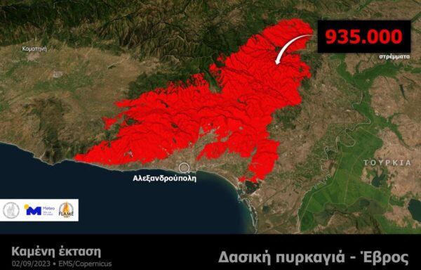 Όπως προκύπτει από την ανάλυση των δορυφορικών δεδομένων, η συνολική έκταση που κατέκαψε η δασική πυρκαγιά του Έβρου, η οποία προέκυψε από τη συνένωση των πυρκαγιών σε Αλεξανδρούπολη και Δαδιά, ξεπερνά τα 935.000 στρέμματα (έως την 02.09.2023, 11:31 τοπική ώρα).