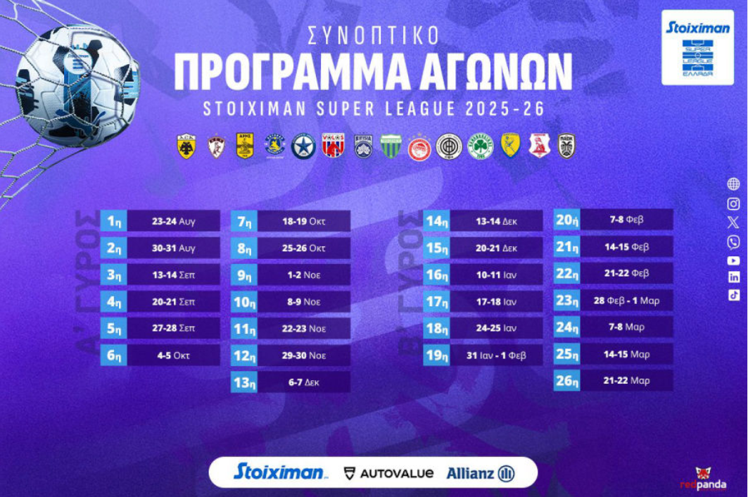 Παράλληλα με την παρουσίαση της νέας μπάλας, η Super League δημοσίευσε και το συνοπτικό ημερολόγιο των αναμετρήσεων της κανονικής διάρκειας του πρωταθλήματος. Αυτό σημαίνει ότι οι ομάδες, οι προπονητές και οι οπαδοί θα έχουν μια πρώτη εικόνα για το πότε θα διεξαχθούν οι αγωνιστικές, προετοιμάζοντας το έδαφος για μια ακόμα συναρπαστική σεζόν.