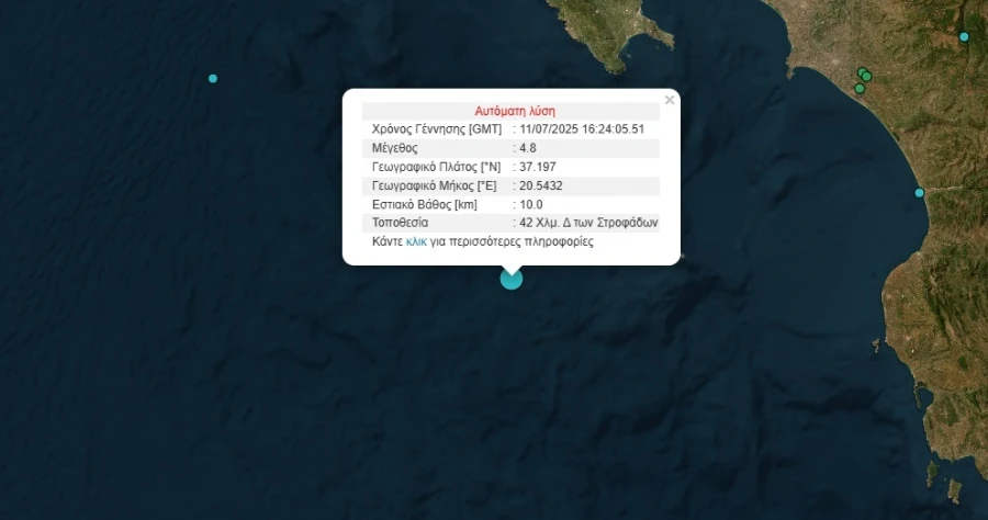Σεισμική δόνηση μεγέθους 4,8 Ρίχτερ σημειώθηκε το απόγευμα της Παρασκευής 11 Ιουλίου, με επίκεντρο τον θαλάσσιο χώρο ανοιχτά της Ζακύνθου.