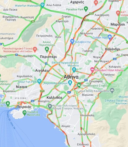Η κίνηση ωστόσο υπάρχει και στο αντίθετο ρεύμα λόγω της ώρας αιχμής. Έτσι δυσκολίες παρατηρούνται στην άνοδο και την κάθοδο του Κηφισού. Επίσης κίνηση παρατηρείται στα δύο ρεύματα της Λεωφόρος Ποσειδώνος, στη Λεωφόρο Κηφισίας αλλά και στο κέντρο της Αθήνας.