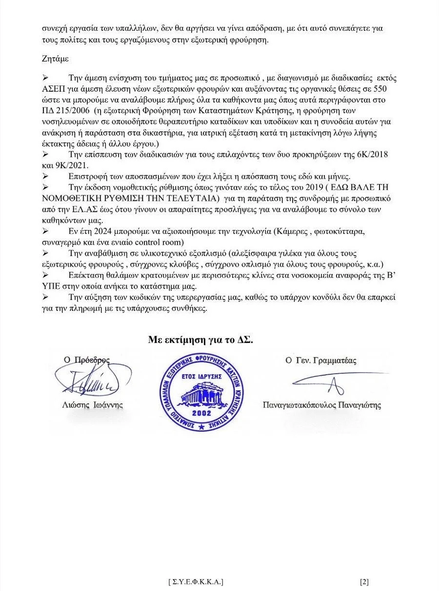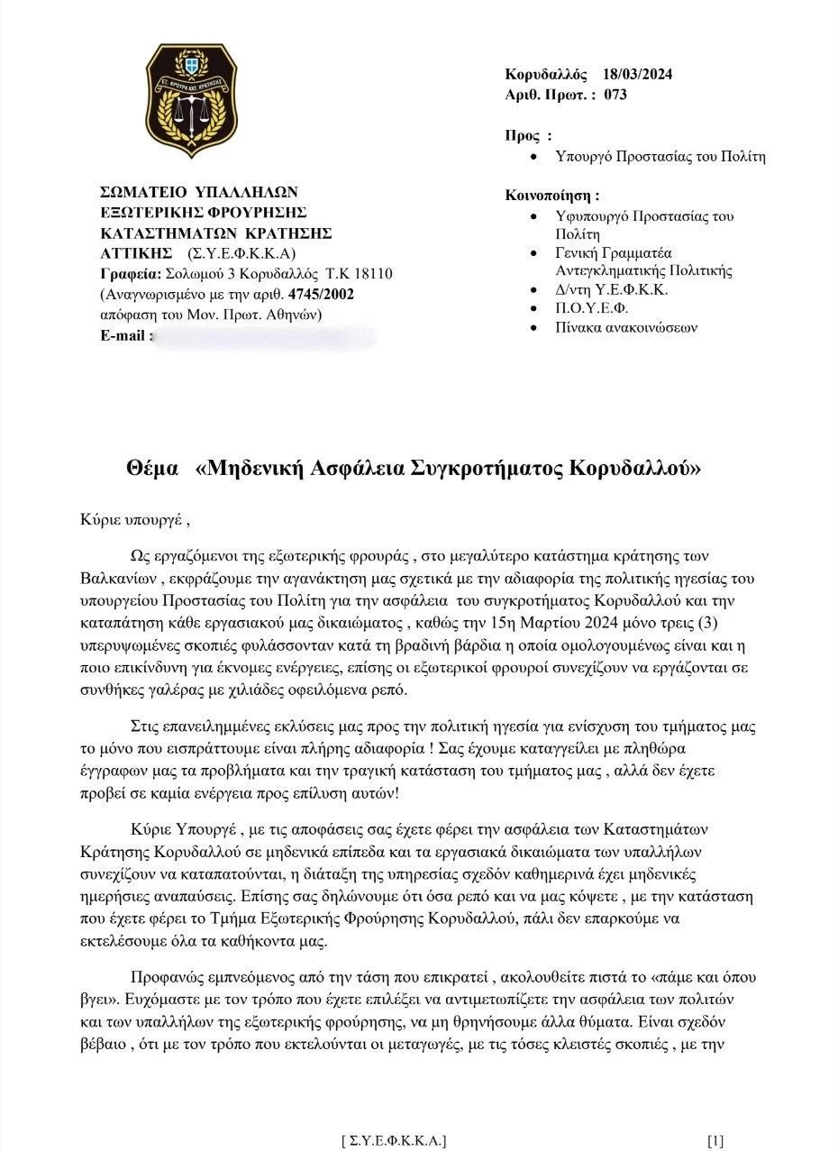 Η επιστολή του Σωματείου των Ειδικών Φρουρών (ΣΥΕΦΚΚΑ) προς τον υπουργό Προστασίας του Πολίτη