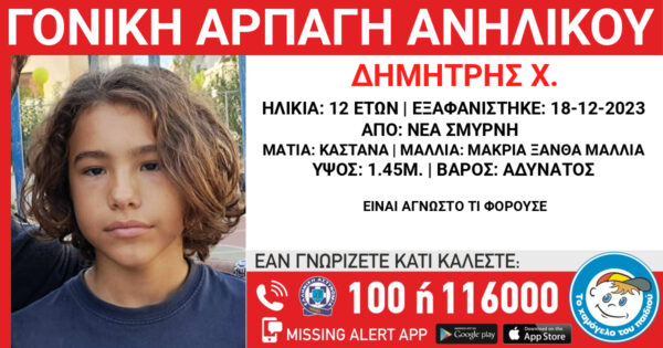Στις 18 Δεκεμβρίου η μητέρα του Δημήτρη Χ. 12 ετών προέβη σε γονική αρπαγή του ανήλικου, στην περιοχή της Νέας Σμύρνης και έκτοτε αγνοούνται.