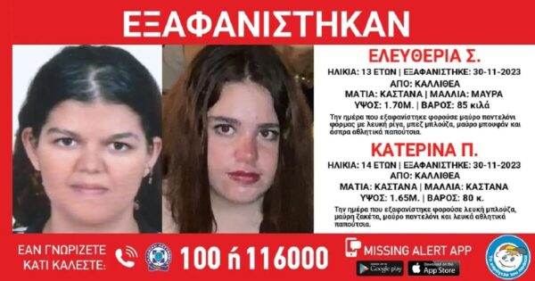 Συναγερμός έχει σημάνει στην Καλλιθέα καθώς σήμερα Πέμπτη (30/11) εξαφανίστηκαν από την Καλλιθέα η 13χρονη Ελευθερία και η 14χρονη Κατερίνα που φαίνεται να επιβιβάστηκαν σε ταξί με άγνωστο προορισμό, σύμφωνα με το Χαμόγελο του Παιδιού.