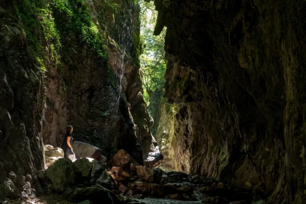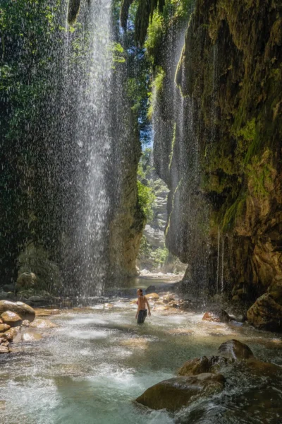 Εξίσου εντυπωσιακή είναι, όμως, και η διαδρομή για να βρεθείτε στο συγκεκριμένο σημείο, καθώς πρέπει να διανύσετε πεζή τα καφεπράσινα νερά του Κρικελλοπόταμου με τα πόδια. Αν και ακούγεται αποθαρρυντικό, το river trekking μέσα από την κοίτη του ποταμού είναι σχετικά εύκολο τόσο για πεπειραμένους όσο και μη πεζοπόρους με το ύψος του νερού να φτάνει περίπου μέχρι τη μέση και την όλη διαδικασία να απαιτεί πολύ καλή προετοιμασία με σωστό εξοπλισμό.