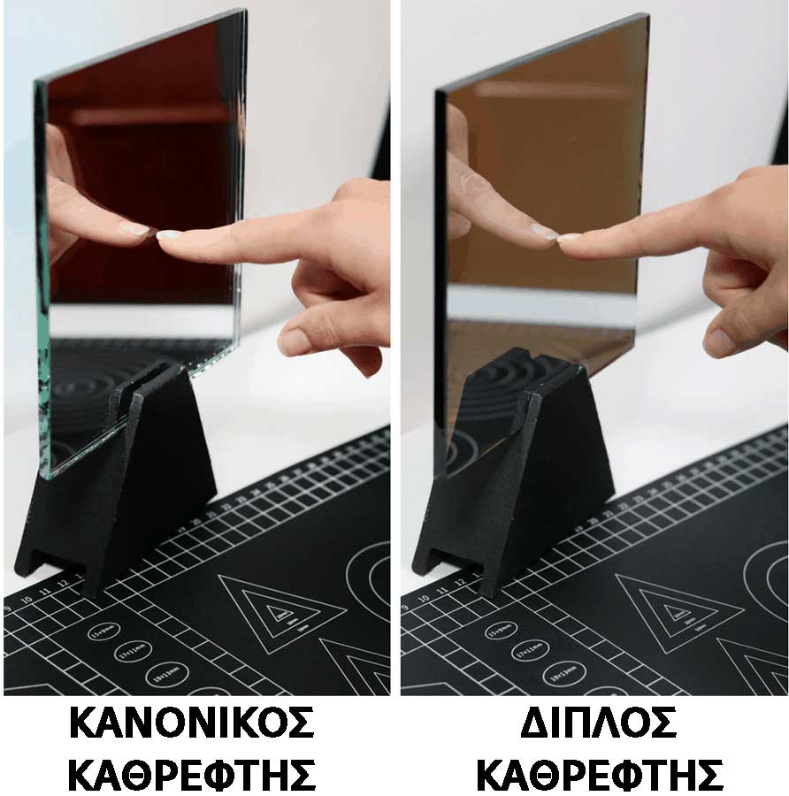 Εάν η άκρη του δακτύλου σας αγγίζει απευθείας την αντανάκλαση χωρίς κανένα κενό, τότε είναι πολύ πιθανό να πρόκειται για διπλό καθρέφτη. Αυτή η άμεση επαφή οφείλεται στον τρόπο κατασκευής τους, όπου η ανακλαστική επιφάνεια βρίσκεται στην μπροστινή πλευρά του γυαλιού, και όχι πίσω από αυτό.