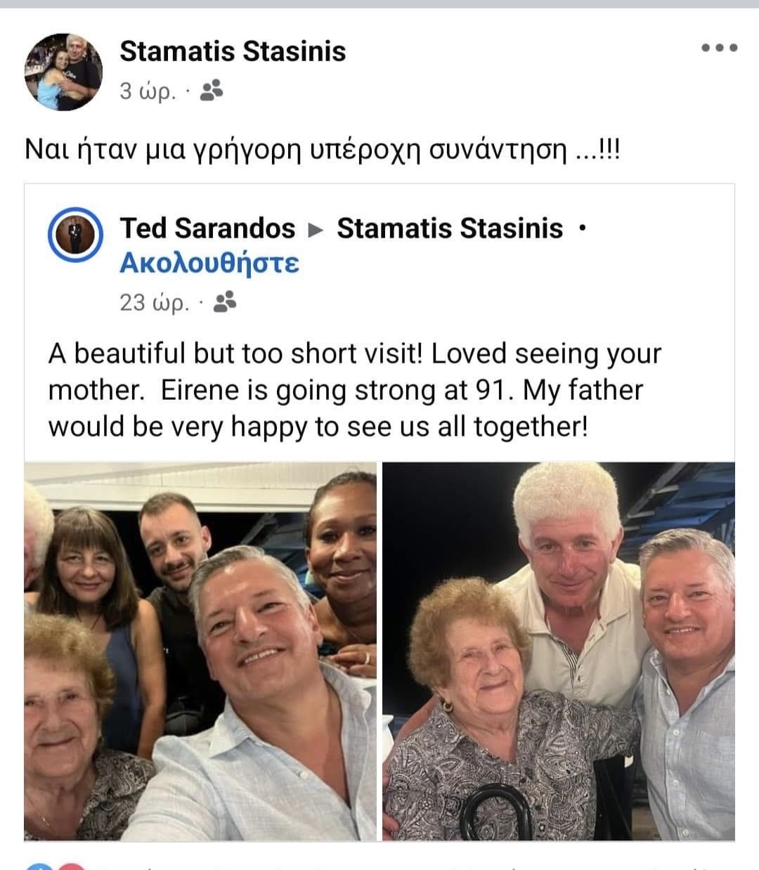 Πρόσφατα, ο Sarandos επισκέφθηκε τη Σάμο με το προσωπικό του γιοτ, όπου παρέμεινε για δύο ημέρες και συναντήθηκε με τη 91χρονη θεία του και τα ξαδέλφια του. Μάλιστα, ανάρτησε και σχετική φωτογραφία στο Facebook, την οποία έστειλε στον ξάδελφό του, Σταμάτη Στασινή.