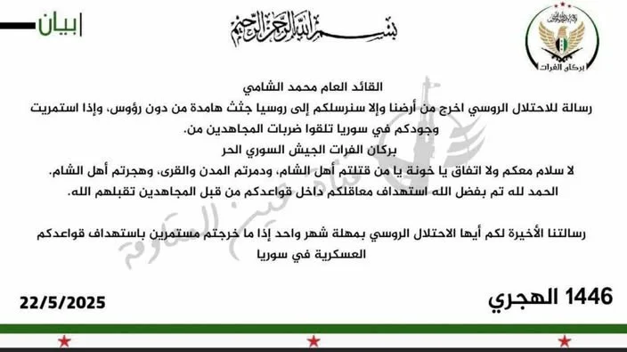Το τελευταίο μας μήνυμα προς εσάς, την ρωσική κατοχή, είναι μια προθεσμία ενός μηνός. Αν δεν φύγετε, θα συνεχίσουμε να στοχεύουμε τις στρατιωτικές σας βάσεις στην Συρία».