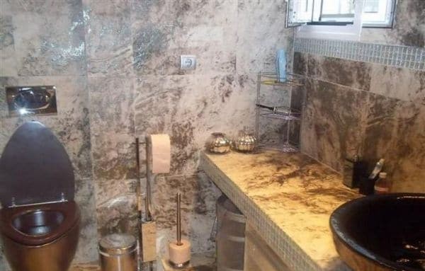 Από τα πιο ωραία σημεία του σπιτιού είναι η κουζίνα, σε μοντέρνο σχέδιο και χρώματα, αντικείμενα με συμβολική αξία. Ενώ εντύπωση προκαλούν και οι τουαλέτες (στις φωτογραφίες υπάρχει η μια εκ των τριών τουαλετών του σπιτιού).