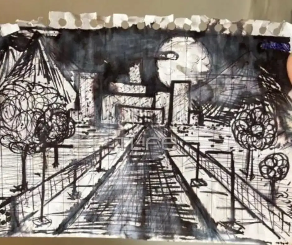 Ένα ανατριχιαστικό σκίτσο που σχεδίασε ο 23χρονος Άγγελος Τηλκερίδης λίγες ημέρες πριν την τραγωδία. Μοιάζει σήμερα αρκετά προφητικό. Στο σκίτσο απεικονίζεται ένα τούνελ, ράγες τρένου που χάνονται στο σκοτάδι, ένας ουρανός γεμάτος μαυρίλα και καπνούς. Χωράφια δεξιά και αριστερά και μια μορφή να περνά μπροστά από το φεγγάρι, σαν μια σκιά που βαδίζει προς το άγνωστο.