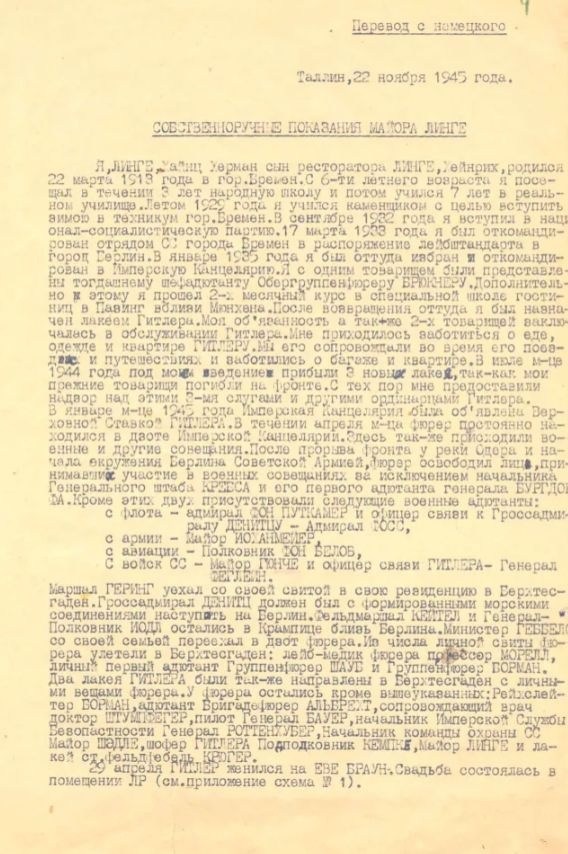 Ένας Ρώσος αρχειονόμος παρουσιάστηκε σε βίντεο εξετάζοντας την αφήγηση του Λίνγκε, η οποία περιγράφει λεπτομερώς ακόμη και τα ρούχα που φορούσαν ο Χίτλερ και η Εύα Μπράουν τη στιγμή του θανάτου τους. Σύμφωνα με τον αρχειονόμο, ο Λίνγκε ανέφερε ότι ο Χίτλερ πίστευε πως η συνέχιση του αγώνα ήταν μάταιη, φοβούμενος τη σύλληψη και επηρεασμένος από την επιδεινούμενη σωματική του κατάσταση και τη μεγαλομανία που δεν του επέτρεπε να υποκύψει ή να διαπραγματευτεί.