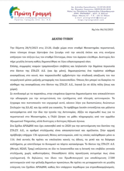 Με αφορμή και το συμβάν της 28ης Σεπτεμβρίου, το Συνδικάτο Σταθμαρχών εξέδωσε ανακοίνωση στην οποία επιβεβαιώνει ότι την περασμένη Πέμπτη στον σταθμό του Μετρό στο Μοναστηράκι, έναν από τους πιο κεντρικούς της πρωτεύουσας, ομάδα νεαρών επιτέθηκε σε ζευγάρι και αφού έκλεψαν υπό την απειλή όπλου από την γυναίκα τα κοσμήματα που φορούσε, απήγαγαν τον άνδρα, τον οποίο έβαλαν διά της βίας σε συρμό που αναχωρούσε. Οι δράστες τον άφησαν ελεύθερο στον Σταθμό του Συντάγματος.