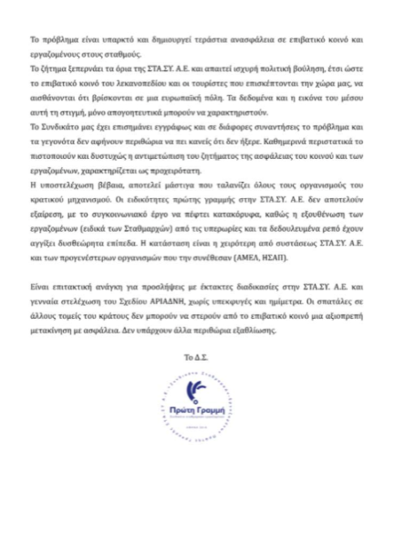 Προσθέτουν πως έχουν ενημερώσει τους αρμοδίους «και τα γεγονότα δεν αφήνουν περιθώρια να πει κανείς ότι δεν ήξερε». Αναφέρουν, δε, πως διάφορα περιστατικά πιστοποιούν καθημερινά το πρόβλημα. Ενώ «η αντιμετώπιση του ζητήματος της ασφάλειας του κοινού και των εργαζομένων, χαρακτηρίζεται ως προχειρότατη».