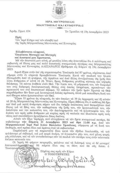 Εκοιμήθη ο Μητροπολίτης Μαντινείας και Κυνουρίας Αλέξανδρος – Πότε και που θα γίνει η κηδεία του