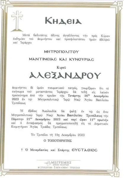 Η κηδεία του μακαριστού Αλεξάνδρου θα γίνει αύριο Πέμπτη στις 11 το πρωί (όπως ανακοινώθηκε από την Ι. Μ. Μαντινείας και Κυνουρίας) στον Ιερό Μητροπολιτικό Ναό Αγίου Βασιλείου Τριπόλεως, όπου στις 26 Φεβρουαρίου 1995 είχε γίνει και η ενθρόνισή του.