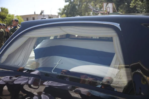 λίγο πριν από τις 16:20 έφτασε στην εκκλησία το φέρετρο με τη σορό του Περικλή Στεφανίδη, τυλιγμένο με τη γαλανόλευκη.