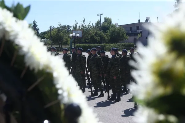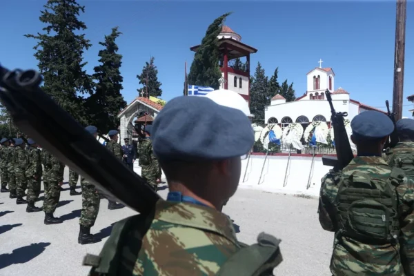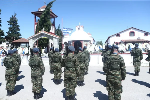 Εξω από την εκκλησία έχει φτάσει και το άγημα της Π.Α. προκειμένου να αποδώσει τιμές στον Ανθυποσμηναγό Περικλή Στεφανίδη.