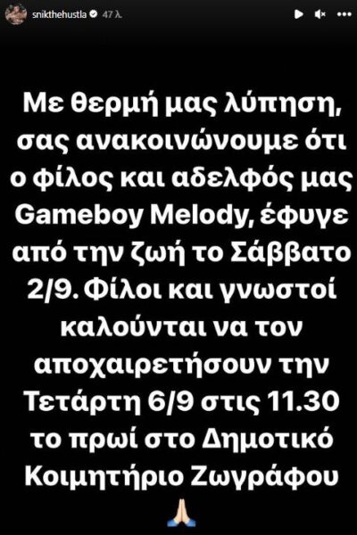 Όπως ανέφερε ο πασίγνωστος τράπερ Snik σε story του στο Instagram , ο Gameboy έφυγε από τη ζωή το Σάββατο 2 Σεπτεμβρίου και η κηδεία του θα πραγματοποιηθεί την Τετάρτη στο κοιμητήριο Ζωγράφου.