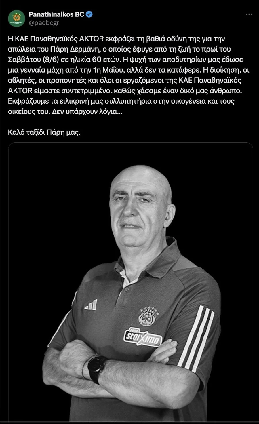 Συγκεκριμένα, σε σχετική ανάρτησή της στα μέσα κοινωνικής δικτύωσης, η ΚΑΕ Παναθηναϊκός ανέφερε: «Η ΚΑΕ Παναθηναϊκός AKTOR εκφράζει τη βαθιά οδύνη της για την απώλεια του Πάρη Δερμάνη, ο οποίος έφυγε από τη ζωή το πρωί του Σαββάτου (8/6) σε ηλικία 60 ετών. Η ψυχή των αποδυτηρίων μας έδωσε μια γενναία μάχη από την 1η Μαΐου, αλλά δεν τα κατάφερε».