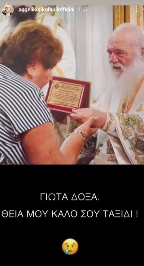 Η δημοσιογράφος έκανε γνωστή την είδηση του θανάτου της θείας της με ανάρτησή της στα instastories το μεσημέρι της Παρασκευής (12/04) ανεβάζοντας μία φωτογραφία από τη στιγμή που παραλάμβανε μία τιμητική πλακέτα από τον Αρχιεπίσκοπο Ιερώνυμο.