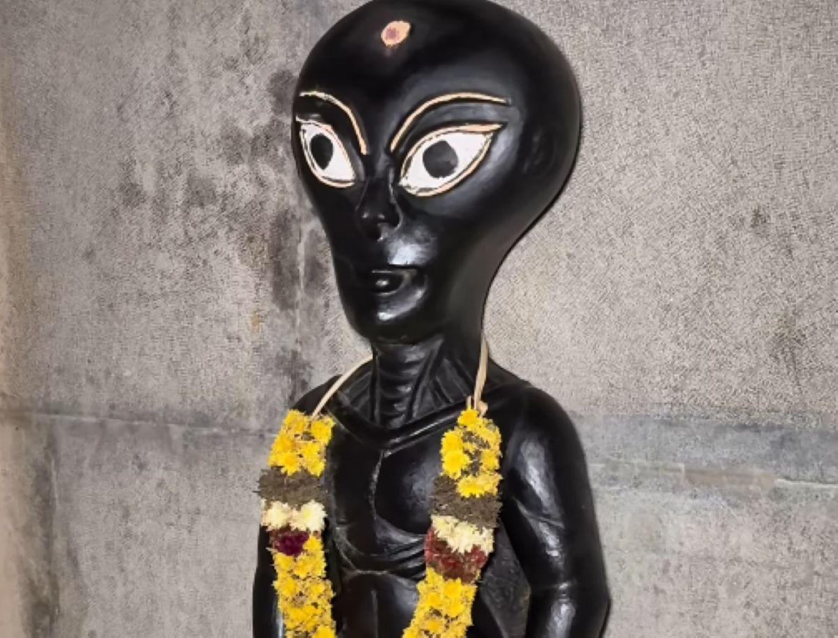 Σε αντίθεση με τους συνηθισμένους ναούς που φιλοξενούν αγάλματα θεών από την ινδουιστική παράδοση, ο συγκεκριμένος χώρος λατρείας στεγάζει ένα μαύρο άγαλμα εξωγήινου, τοποθετημένο στο κέντρο του υπόγειου θαλάμου.