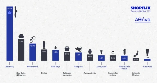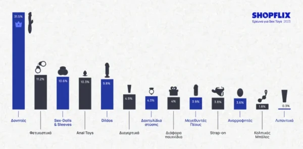 H ομάδα του Shopflix επεξεργάστηκε δεδομένα σχετικά με τις προτιμήσεις των Ελλήνων για τα ερωτικά βοηθήματα ανά ηλικία και περιοχή για το 2023 και παρουσιάζει σχετική έρευνα.