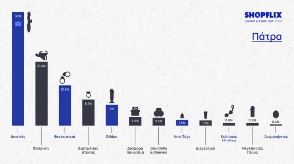 Οι δονητές είναι παντού πρώτοι, με την Αθήνα να κλείνει την πρώτη 3άδα με sex dolls και φετιχιστικά. Στη Θεσσαλονίκη τα sex dolls και dildos. Ενώ στην Πάτρα εμφανίζονται στην 2η θέση τα stap-on και κλείνει η τριάδα με φετιχιστικά. Στη λίστα εμφανίζονται για πρώτη φορά τα δαχτυλίδια στύσης και μάλιστα στην 4η θέση.