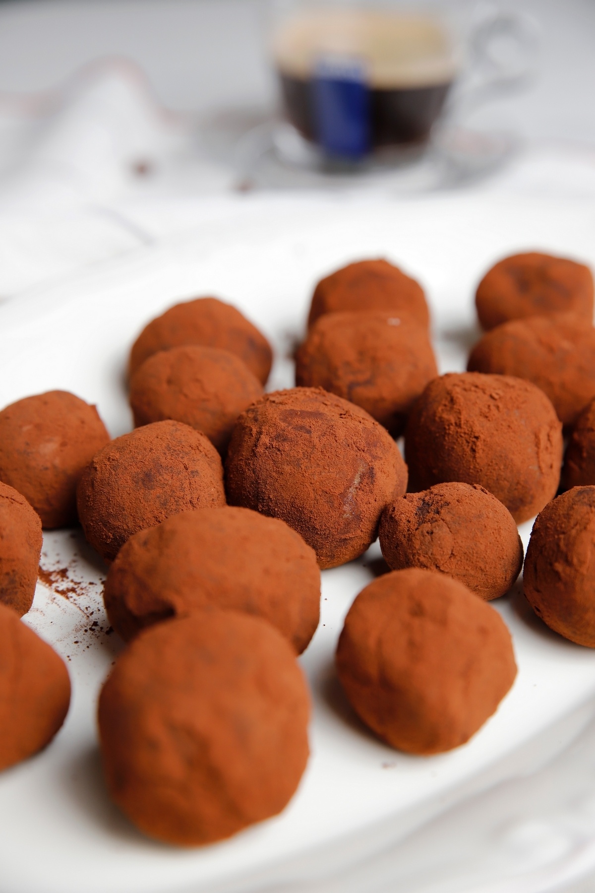 Σερβίρισμα: Ρολάρουμε κάθε μπαλίτσα στο κακάο σε σκόνη για να επικαλυφθεί πλήρως. Τοποθετούμε τις έτοιμες τρούφες σε δίσκο ή δοχείο που κλείνει αεροστεγώς. Μπορούν να σερβιριστούν αμέσως ή να διατηρηθούν στο ψυγείο για έως δύο ημέρες.