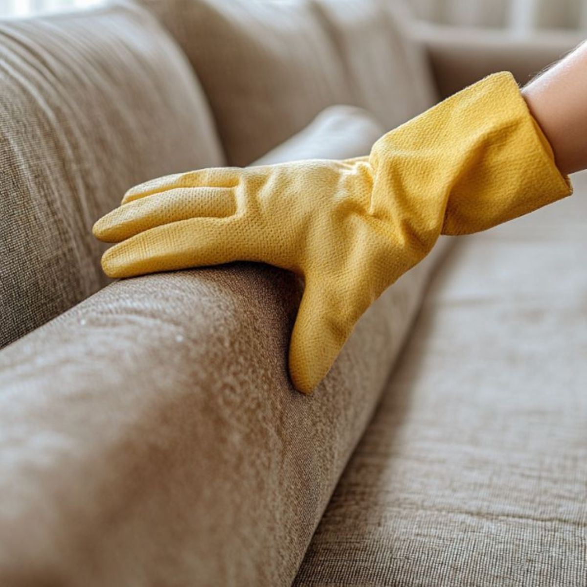 Αρχικά, φορέστε τα λαστιχένια γάντια σας και ψεκάστε ελαφρά τις επιφάνειές τους με το αρωματικό μείγμα. Η υγρασία βοηθά στη φυσική έλξη σκόνης και τριχών, μετατρέποντας τα γάντια σε ένα «μαγνητικό» εργαλείο καθαρισμού.