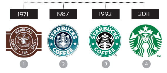 - 1971 (Αρχικό): Η Σειρήνα ήταν σε κυκλικό καφέ πλαίσιο, με το όνομα “Starbucks Coffee, Tea, and Spice”. Ήταν ιδιαίτερα λεπτομερής και σε στυλ αρχαίου ξυλόγλυπτου.