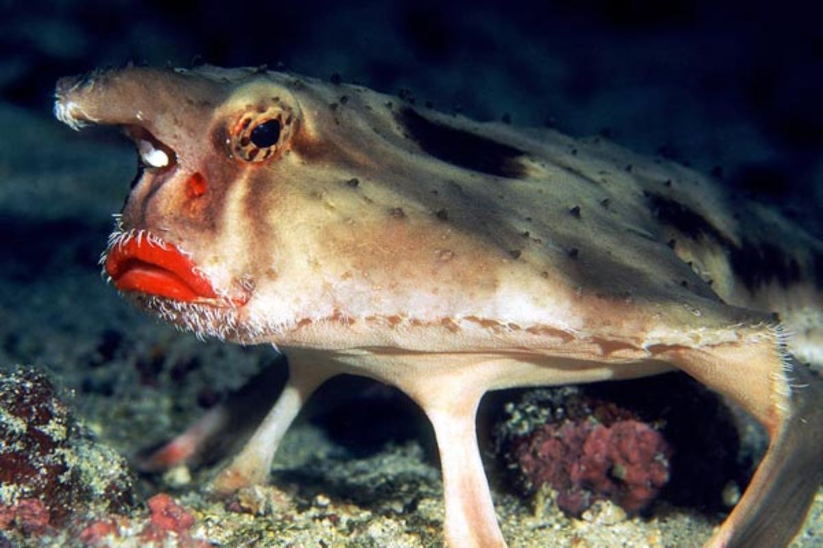 The red-lipped batfish of the Galapagos islands walks on the ocean floor using its fins