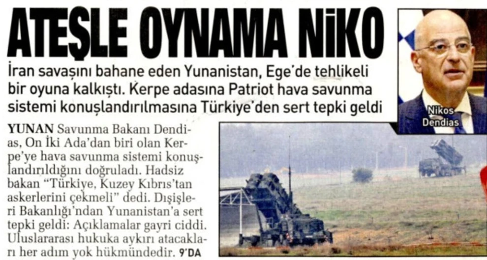 Η τουρκική εφημερίδα Sabah κυκλοφόρησε σήμερα, Παρασκευή 6 Μαρτίου 2026, με έναν άκρως επιθετικό τίτλο που στοχοποιεί προσωπικά τον Έλληνα Υπουργό Εθνικής Άμυνας. Το πρωτοσέλιδο «Μην παίζεις με τη φωτιά, Νίκο» αποτυπώνει το κλίμα νευρικότητας της γείτονος, η οποία επιχειρεί να εγείρει ζητήματα αποστρατιωτικοποίησης των νησιών με πρόσχημα τις διεθνείς συνθήκες.