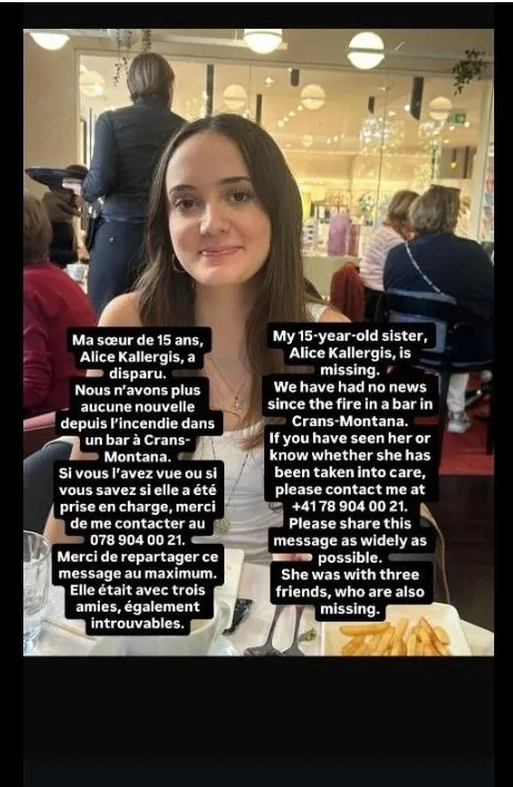 Ώρες αγωνίας και ένα αδιανόητο θρίλερ εξελίσσεται γύρω από την τύχη της 15χρονης Αλίκης Καλλέργη, μετά την πολύνεκρη πυρκαγιά που ξέσπασε στο μπαρ Le Constellation στο Κραν Μοντανά της Ελβετίας την Πρωτοχρονιά. Ενώ οι πληροφορίες για τον θάνατό της έκαναν τον γύρο του διαδικτύου, μια νέα ανάρτηση από το στενό οικογενειακό της περιβάλλον αλλάζει τα δεδομένα.