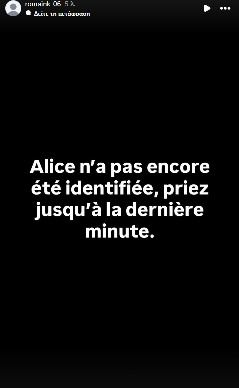 «Η Αλίκη δεν έχει ακόμη ταυτοποιηθεί, προσευχηθείτε μέχρι το τελευταίο λεπτό», έγραψε ο αδερφός της, ζητώντας από τον κόσμο να μην αναπαράγει ανεπιβεβαίωτες ειδήσεις και να συνεχίσει να ελπίζει σε ένα θαύμα.