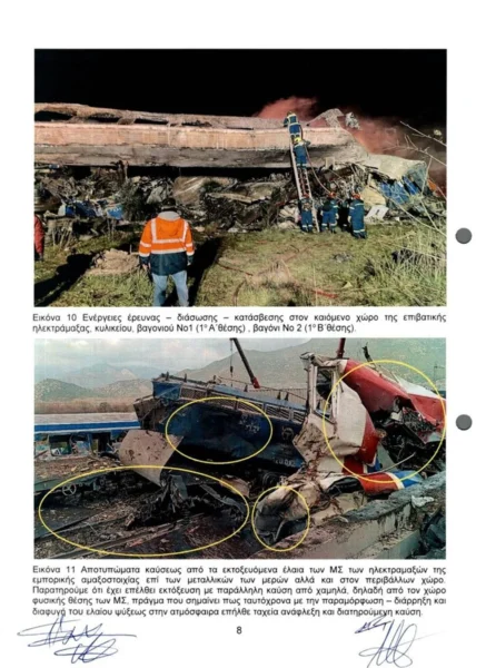 i) άνωθεν της σιδηροδρομικής γραμμής (σημείο στο οποίο βρέθηκαν οι δύο ηλεκτράμαξες της εμπορικής αμαξοστοιχίας με τους μετασχηματιστές τους διερρηγμένους).