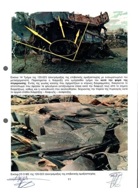 «Εντός του ίδιου δευτερολέπτου μετά την εμφάνιση της 2ης ισχυρής ηλεκτρικής εκκένωσης εμφανίζεται η πρώτη εστία εκδήλωσης πυρκαγιάς η οποία αμέσως μετά και εντός millisecond αυξάνει την έντασή της με αποτέλεσμα να ακολουθεί μία ακαριαία βίαιη ανάφλεξη της περιοχής συγκρούσεως, η οποία οδηγεί σε μεγάλης έκτασης πυρκαγιά και εκτοξεύσεις φλεγόμενων τεμαχίων ύλης από την σύγκρουση».