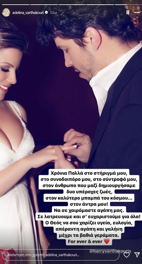 «Χρόνια Πολλά στο στήριγμά μου, στον συνοδοιπόρο μου, στον σύντροφό μου, στον άνθρωπο που μαζί δημιουργήσαμε δύο υπέροχες ζωές, στον καλύτερο μπαμπά του κόσμου… στον άντρα μου! Να σε χαιρόμαστε αγάπη μας. Σε λαυτρεύουμε και σ’ευχαριστούμε για όλα! Ο Θεός να σου χαρίζει υγεία, ευλογία, απέραντη αγάπη και γαλήνη μέχρι τα βαθιά γεράματα. For ever & ever», έγραψε στην ανάρτησή της η Αντελίνα Βαρθακούρη.