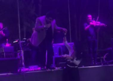 Αρχικά, ο καλλιτέχνης εμφανίζεται άνετος στο κέντρο της σκηνής. Στη συνέχεια, πλησιάζει προς την άκρη, όπου ακριβώς από κάτω βρισκόταν μια κοπέλα που πετούσε λουλούδια.