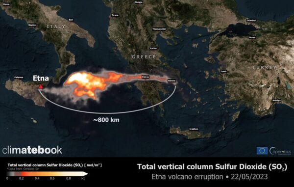 Σύμφωνα με το Climatebook ο καπνός και η στάχτη από την τέφρα που εκτοξεύτηκε έφτασε μέχρι και την Αθήνα και το Αιγαίο σε πολύ μεγάλα ύψη (>5 km). Το πλούμιο του Διοξειδίου του Θείου (SO2) που ανιχνεύτηκε από τον δορυφόρο Sentinel-5P της Ευρωπαϊκής Υπηρεσίας Copernicus την Δευτέρα 22/05, ταξίδεψε σχεδόν 800 χλμ φτάνοντας μέχρι και την Αθήνα και το Αιγαίο.