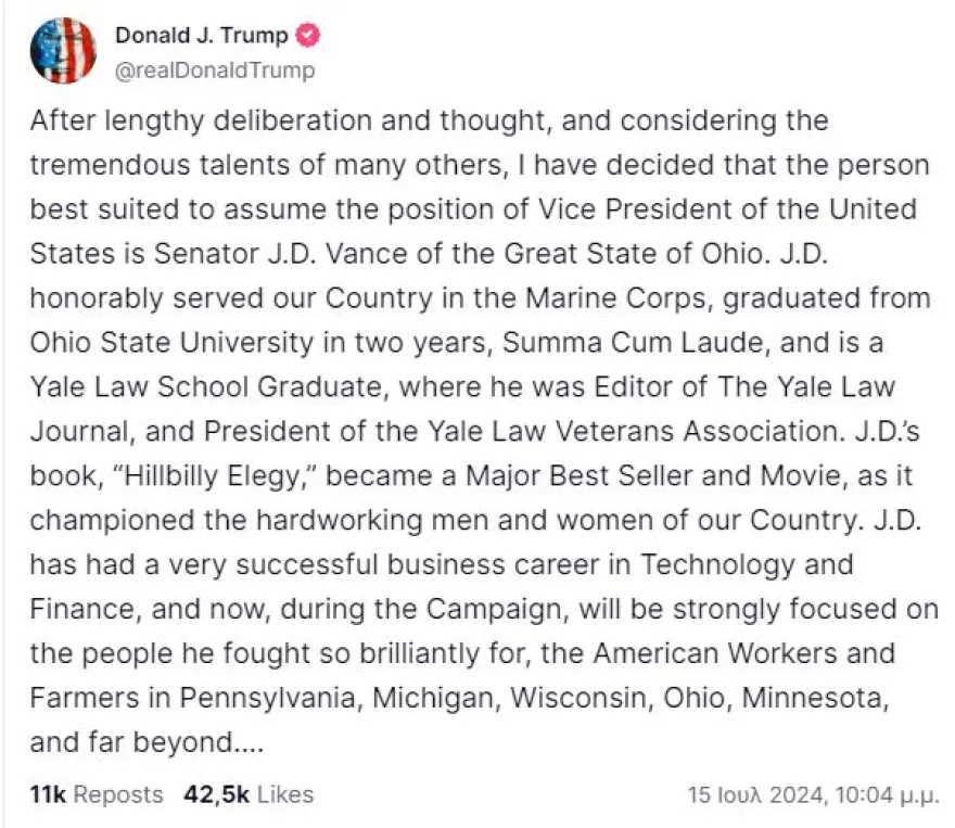 Και πρόσθεσε: «Ο JD είχε μια πολύ επιτυχημένη επιχειρηματική καριέρα στον τομέα της τεχνολογίας και των οικονομικών, και τώρα, κατά τη διάρκεια της εκστρατείας, θα επικεντρωθεί έντονα στους ανθρώπους για τους οποίους αγωνίστηκε τόσο λαμπρά. Ως αντιπρόεδρος, θα συνεχίσει να αγωνίζεται για το σύνταγμά μας, θα σταθεί στο πλευρό των στρατευμάτων μας και θα κάνει ό,τι μπορεί για να με βοηθήσει να κάνω την Αμερική μεγάλη ξανά».