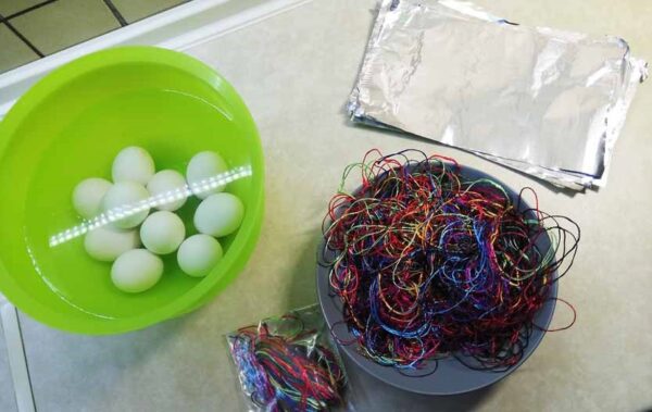Τα βήματα παρακάτω είναι προαιρετικά και σίγουρα υπάρχουν πολλές εναλλακτικές επιλογές!Μπορείτε με τις κλωστές(χωρίς να τις κόψετε μικρά κομμάτια) να τυλίξετε τα αυγά, με κάποιο συγκεκριμένο μοτίβο, μια κλωστή κόκκινη μια πράσινη.
