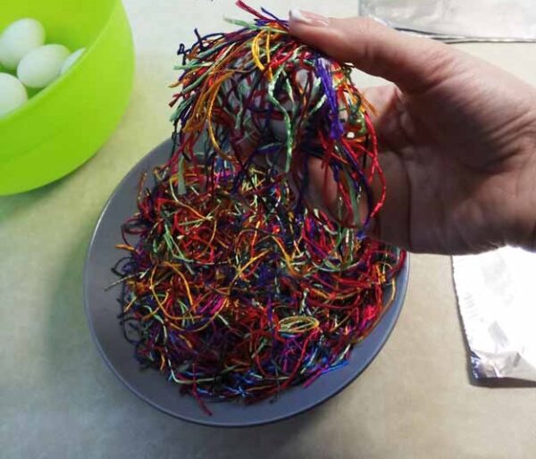 4) Παίρνουμε το αυγό και όπως είναι βρεγμένο το κυλάμε μέσα στις κομμένες κλωστές με σκοπό να κολλήσουν πάνω του.