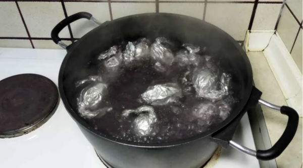 Μπορείτε επίσης να τυλίξετε τα αυγά μέσα σε καλσόν αντί για αλουμινόχαρτο. Ή να βάλετε λίγο ξύδι μέσα στην κατσαρόλα την ώρα που βγάζουν τα αυγά.