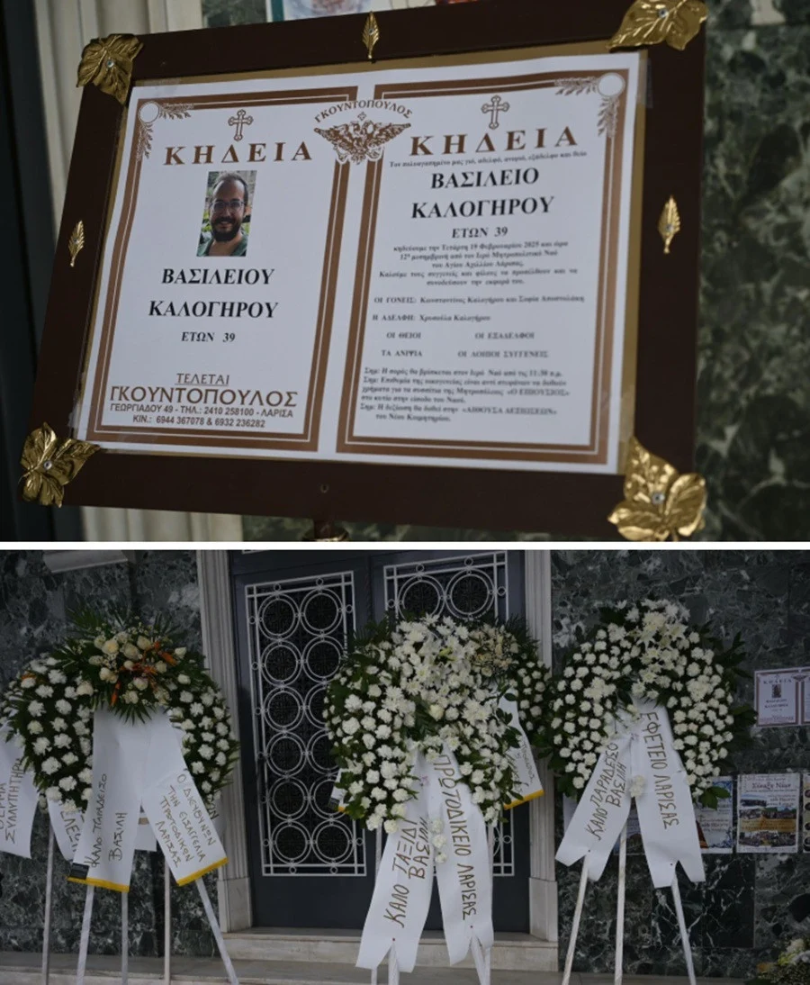 Στεφάνια από φορείς και θεσμικούς παράγοντες. Όπως η Ένωση Δικαστών και Εισαγγελέων, η πρόεδρος και οι δικαστές του Αρείου Πάγου, η Εισαγγελία Πρωτοδικών Λάρισας και ο Δικηγορικός Σύλλογος Λάρισας, κατέκλυσαν τον αύλειο χώρο του ναού, τιμώντας τη μνήμη του Βασίλη Καλογήρου και υπογραμμίζοντας τη θέση της μητέρας του στο δικαστικό σώμα.